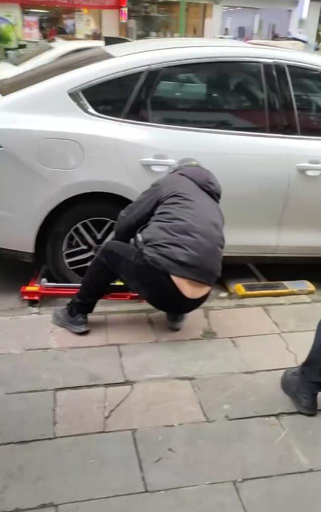 况女士称,她大概20分钟后到达车位,发现自己的车已被挪到前方车位,地锁已抬起并开始计费。“附近门店的朋友拍到对方私自挪车的视频。”况女士说,视频里几个陌生人用“挪车工具”将车辆四个车轮架起后推行挪动。