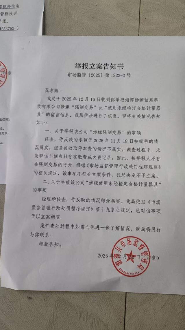 况女士又向当地市场监督管理局投诉,举报该公司存在强制交易行为,且涉嫌使用未经检定合格的计量器具。该局书面答复称,经查,你反映的车辆于2025年11月18日被挪动的情况属实,但被收取停车费的情况不属实,调查中未发现该车辆当日有缴费或欠费记录;关于“涉嫌使用未经检定合格计量器具”,经现场核查,你反映的情况部分属实。依据《市场监督管理行政处罚程序规定》第十九条,我局已对该事项立案调查。